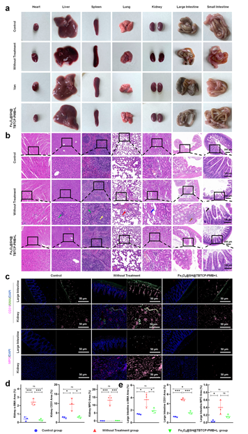 基于以上研究,该团队利用磁性纳米颗粒(NPs)独特的病原体富集与捕获能力,以及磁性分离特性,成功规避了与血液循环和代谢相关的问题,制备了一种聚集诱导发光光敏剂武装的磁性纳米颗粒,Fe3O4@SH@TBTCP-PMB,用于治疗败血症。磁性NPs和PDT的协同作用为败血症治疗提供了有效的解决方案,为进一步解决光敏药物或抗菌材料在败血症治疗过程中对耐药细菌捕获能力不足以及长期血液循环和代谢困难等问题提供理论指导。该工作以“Aggregation-Induced Emission Photosensitizer-Armored Magnetic Nanoparticles for Sepsis Treatment: Combating Multidrug-Resistant Bacteria and Alleviating Inflammation”为题发表在《Advanced Functional Materials》上。微密圈