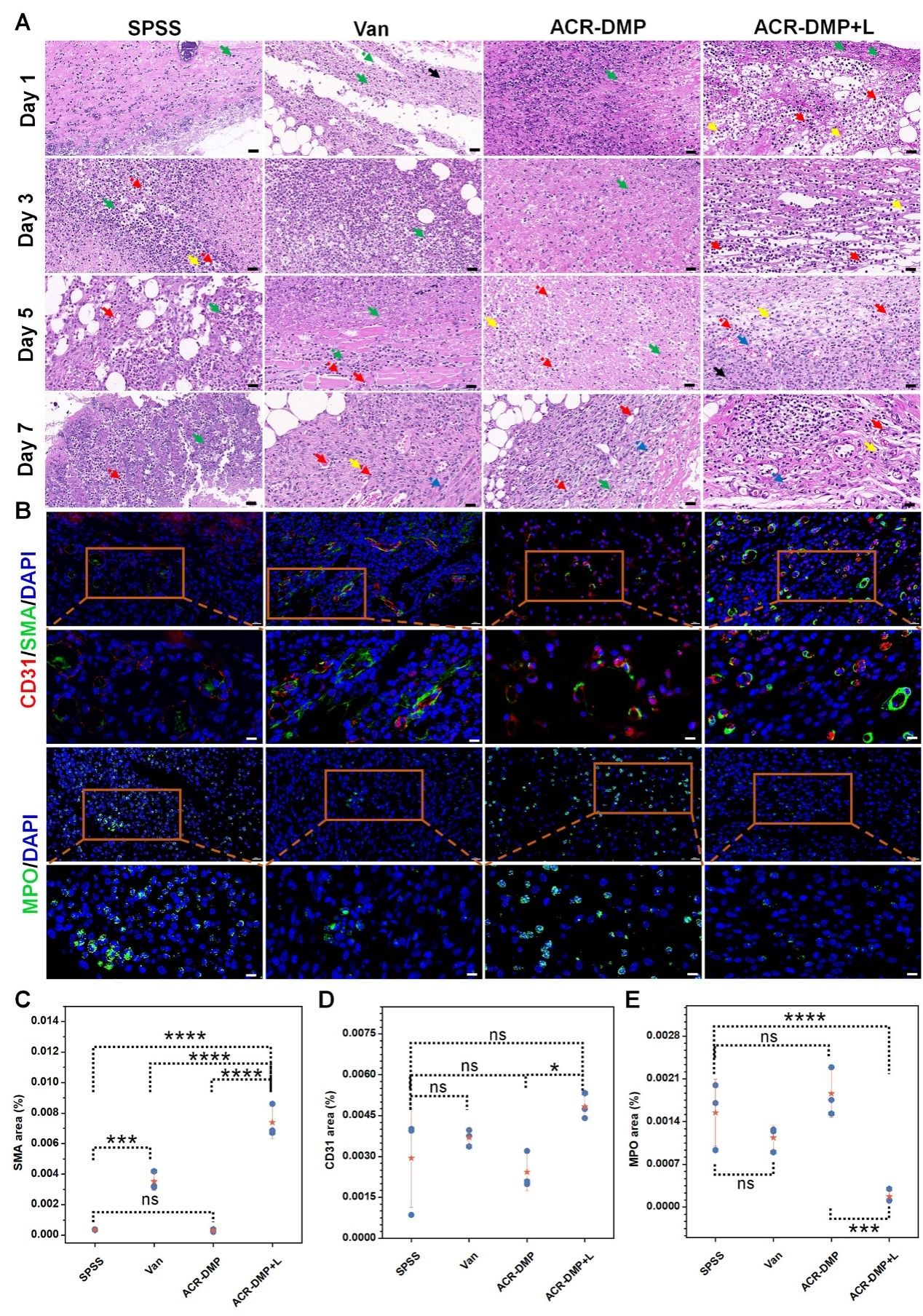 在体内清除植入物生物膜实验中,ACR-DMP相比于万古霉素效果更加显著。ACR-DMP介导的PDT(ACR-DMP +L)在第1天杀死了大部分生物膜中的MRSA,到第 5 天细菌完全被消除,伤口的炎症反应与平板时间也证实了其清除生物膜的优异效果。此外,苏木精-伊红(H&E)染色(图10)和免疫荧光染色评估伤口组织病理变化,证明了ACR-DMP介导的PDT在对抗MRSA生物膜感染方面具有缓解炎症、增强血管形成和加速伤口愈合的能力。