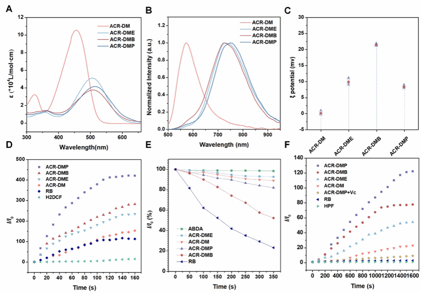 PSs的光物理性质如图2所示。其中ACR-DMB可通过I型和II型通路产生ROS,而ACR-DM、ACR-DME和ACR-DMP作为纯I型PSs,高效生成•OH。ACR-DMP表现出最高的ROS和•OH生成效率。
