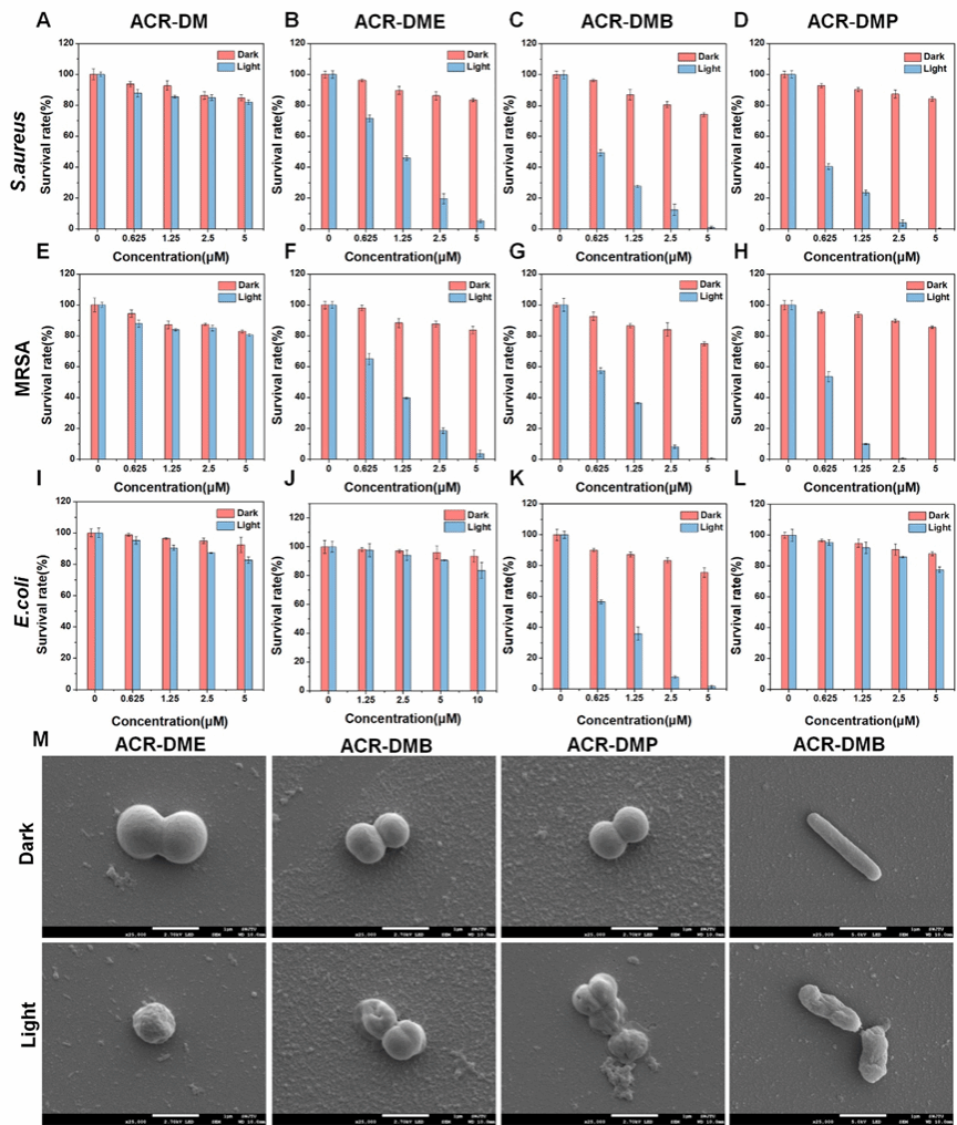 探究了其抗浮游细菌性能(图3),未阳离子功能化的光敏剂(ACR-DM)几乎不能杀死任何细菌。随着修饰正电荷数量的增加,抗菌性能明显提高,单个正电荷的ACR-DME可有效杀灭革兰氏阳性菌,两个正电荷的ACR-DMB对阳性菌和阴性菌均表现出高效的抗菌性能。而硼酸修饰的ACR-DMP具有最优异的抗阳性菌潜力。在光照下,2.5 μM ACR-DMP 消灭了近 100% 的 MRSA。