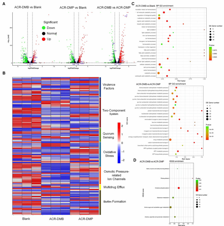 转录组学分析显示(图7),ACR-DMB和ACR-DMP均上调氧化应激相关基因,从而破坏蛋白质合成,同时下调DNA复制、辅因子合成、毒力因子和TCS相关基因。此外,阳离子特性增强了PS的EPS的可穿透性,ACR-DMB和ACR-DMP均上调了渗透压依赖性离子通道的基因,并下调了生物膜形成基因。由于额外的正电荷,ACR-DMB表现出与细胞壁和质膜的更强结合,导致渗透压依赖性离子通道相关的更多基因变化。硼酸修饰为ACR-DMP提供了独特的特性,使其能够下调与QS和多药外排相关的基因,使ACR-DMP能够有效地对抗顽固的生物膜和细菌多药耐药性。