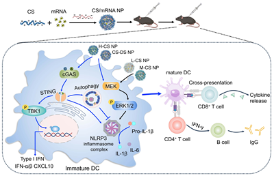 该研究发现多糖纳米化后可成功递送mRNA进入免疫细胞,不同分子量的多糖纳米粒均能提高mRNA抗原的摄取、交叉提呈以及DC细胞成熟,且增强效率随着多糖分子量的增加而上升。高分子量的多糖纳米粒激活强烈的STING信号和自噬通路,以及适度的NLRP3炎症小体信号转导,进而在体内外对mRNA抗原具有显著的免疫增强效果。相比之下,低分子量的多糖纳米粒虽能诱导较强的NLRP3信号但对STING或自噬通路作用较弱,无法诱导强烈的免疫应答。表明纳米多糖的免疫增强作用机制高度依赖于其分子量等性状,揭示了纳米多糖的分子量依赖性的免疫增强机制。
