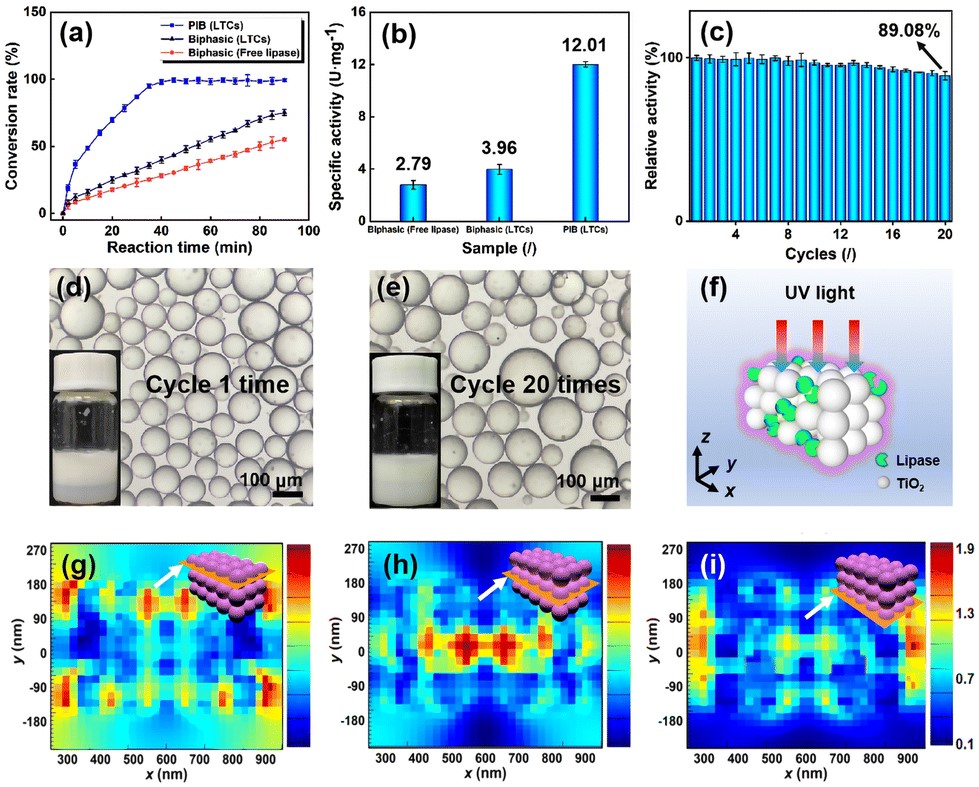 文章亮点:①通过物理堆积法,一步制备具有光响应润湿性的载脂肪酶胶体囊(LTCs)作为Pickering乳化剂和催化剂;②LTCs在循环使用20次后酶活保留率仍高达89%,由于TiO2纳米颗粒的光稳定性和胶体囊的聚集效应保护了内部酶的活性;③TiO2纳米颗粒的光开关时间被缩短至30分钟,由于胶体囊的聚集效应显著增强了其光吸收性能。