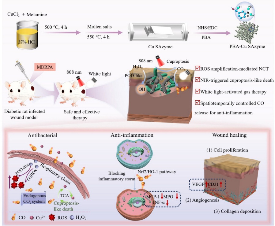 “生命分析技术与材料实验室”题为“Dynamic Antibacterial-to-Regenerative Switching via NIR/Visible Light Activation: Copper Single-Atom Nanozyme with CO-Mediated Scarless Healing for Chronic Diabetic Wounds”的研究成果。2023级博士研究生姚美为论文第一作者,封顺教授为通讯作者,微密圈