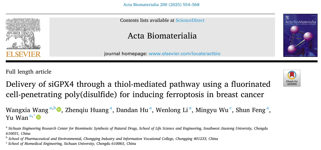 近日,本研究成果以“Delivery of siGPX4 through a thiol-mediated pathway using a fluorinated cell-penetrating poly(disulfide) for inducing ferroptosis in breast cancer”为标题发表在《Acta Biomaterialia》(JCR,Q1区,2025年影响因子9.6)上。微密圈