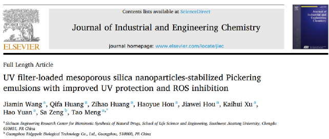 近日,“微纳生物技术”创新团队孟涛教授的最新研究成果:UV filter-loaded mesoporous silica nanoparticles-stabilized Pickering emulsions with improved UV protection and ROS inhibition(负载紫外过滤剂的介孔硅纳米颗粒稳定的Pickering乳液具有增强紫外保护和ROS抑制,DOI: 10.1016/j.jiec.2025.11.045)在国际权威期刊《Journal of Industrial and Engineering Chemistry》(JCR Q1分区)发表。该期刊由韩国化学工程师学会主办,在化妆品科学与技术领域享有盛誉,尤其在化妆品原料开发、配方设计、递送系统和功效评价等方向具有全球影响力,是化妆品领域技术创新与应用研究的重要发表平台。论文第一作者为微密圈