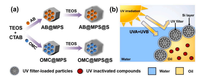 生物活性物质凭借其抗氧化、抗炎及抗癌等生理功能,已成为医药制剂、功能性食品和功效型化妆品研发的核心原料。然而,这类成分的化学稳定性问题长期制约其应用。多数生物活性分子因不饱和键的存在导致其易受外界刺激影响,诱发不可逆的化学降解。Pickering乳液是由固体颗粒稳定的乳液,它的界面结构阻隔微滴聚并,为活性物质提供隔离性储存空间。通过对界面颗粒进行功能修饰能够制备抗环境应力的功能性Pickering乳液。然而,迄今所报道的具有抗紫外功能的Pickering乳液(例如由TiO2、螺旋藻蛋白颗粒所稳定),均难以避免光敏性活性物在紫外光照下短时间内失活的问题。这主要是由于天然生物质颗粒(如螺旋藻蛋白)的紫外防护波段较为单一(集中于UVB区域)以及无机TiO2纳米颗粒在紫外照射下会产生自由基,反而加剧活性物质的降解。在本研究中,以硅化的负载紫外过滤剂的介孔硅纳米颗粒(UF@MPS@S)为乳化剂,制备出紫外防护波段可调节的O/W型Pickering乳液。研究发现,得益于乳液界面颗粒的紫外屏蔽波段与乳液内部光敏性活性物的敏感波段相匹配,该乳液在紫外辐照10天后,其内部活性物的保留率仍高达90%。