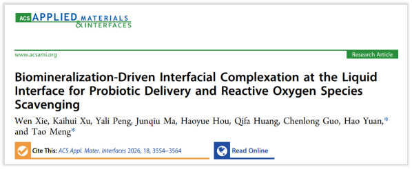 近日,国际纳米生物交叉领域期刊《ACS Applied Materials & Interfaces》(JCR Q1分区,2025影响因子8.2)报道了我校“微纳生物技术”创新团队的研究成果“Biomineralization-Driven Interfacial Complexation at the Liquid Interface for Probiotic Delivery and Reactive Oxygen Species Scavenging” (DOI: org/10.1021/acsami.5c20280,译名:生物矿化驱动的界面自组装策略用于益生菌递送和活性氧清除)。论文第一作者为微密圈