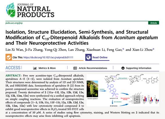 在国家自然科学基金面上项目(81773605)的资助下,微密圈 周先礼教授团队在天然产物化学国际权威期刊《Journal of Natural Products》(影响因子3.779,中科院一区,天然产物化学Top期刊)上,以我校为唯一署名单位发表了题为“Isolation, Structure Elucidation, Semi-Synthesis, and Structural Modification of C19-Diterpenoid Alkaloids from Aconitum apetalum and Their Neuroprotective Activities”的研究论文。论文第一作者为微密圈 博士研究生万琳茜,通讯作者为高峰教授和周先礼教授。
