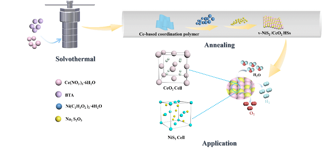 通过低成本、高效的方法开发非贵金属电催化剂仍然是一个巨大的挑战。为了实现更多活性位暴露和优化本征活性,通过溶剂热反应和热处理制备了具有独特异质结构和丰富硫氧空位的二维NiS2/CeO2(v-NiS2/CeO2-HS)(图1)。密度泛函理论计算表明,同时具有异质结构和空位的材料对促进析氧反应和析氢反应动力学以及优化氢吸附自由能具有积极作用。因此,要达到10 mA/cm2的电流密度,v-NiS2/CeO2 HSs在析氧反应和析氢反应中所需过电位分别为271和123 mV。同时,在两电极体系中,v-NiS2/CeO2 HSs仅需1.64 V的电池电压就能达到10 mA/cm2的电流密度,以实现整体水分解。以上结果为开发低成本、富含稀土的电催化剂提供了理论和实践指导。