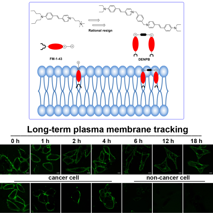 细胞质膜(PM)是细胞内外环境之间的物理屏障,维持着各种生物细胞的完整性。同时PM在细胞生物学中发挥着关键作用,包括细胞的迁移和扩散、膜运输和信号转导等。此外,PM的异常是某些疾病(如癌症)的潜在生物标记物。因此,监测PM的时空变化对膜功能的研究和膜相关疾病的诊断具有重要意义。然而,目前的PM荧光探针存在选择性差、信噪比低、和滞留时间短等缺陷,导致其应用严重受限。微密圈