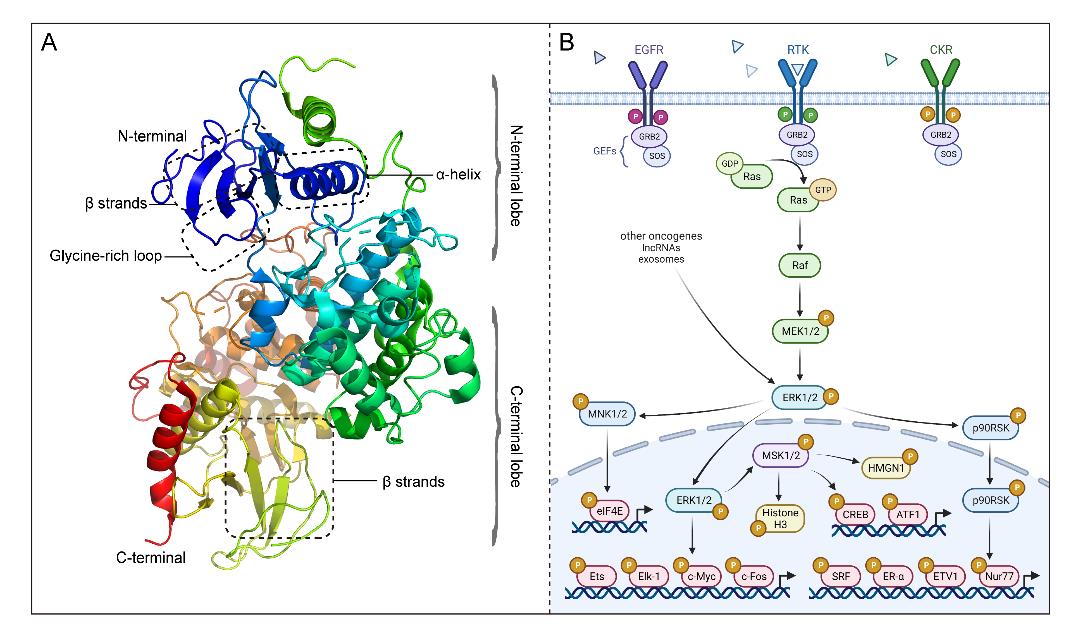 ERK有两种亚型(ERK1ERK2),它们84%的氨基酸残基相同。ERK1/2具有典型的蛋白激酶特征结构双叶型折叠,通过磷酸化底物对细胞生命活动进行调控。其N端结构结合ATP以定位其βγ磷酸基团,而C端结构则催化ATP的磷酸基团转移到ERK1/2的底物上。细胞因子、激素和细胞应激等胞外信号通过多种跨膜受体进入细胞,并沿RAS-RAF-MEK-ERK传递到细胞内,从而调控细胞的重要生命活动。在这个过程中,ERK1/2MEK的唯一底物,却可以磷酸化数百种下游细胞质和细胞核底物,可见其在胞外信号向胞内传递过程中的重要性。