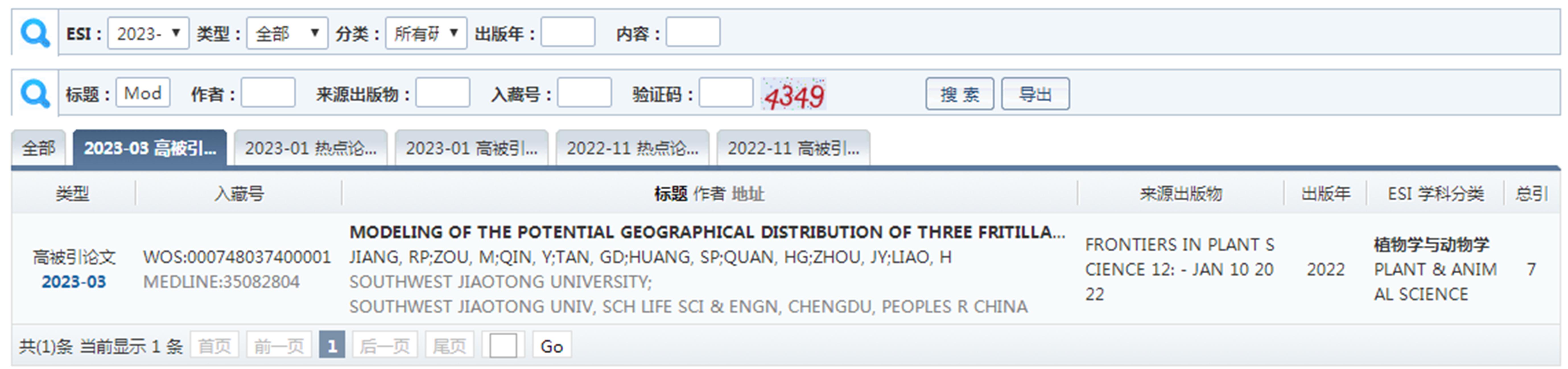 周嘉裕、廖海副教授在植物学国际期刊《Frontiers in Plant Science》上发表题为“Modeling of the Potential Geographical Distribution of Three Fritillaria Species Under Climate Change”的研究型文章成功入选ESI高被引论文。《Frontiers in Plant Science》是植物学领域内最具影响力和权威的期刊之一,该刊目前为JCR分区和中科院分区双一区TOP期刊。