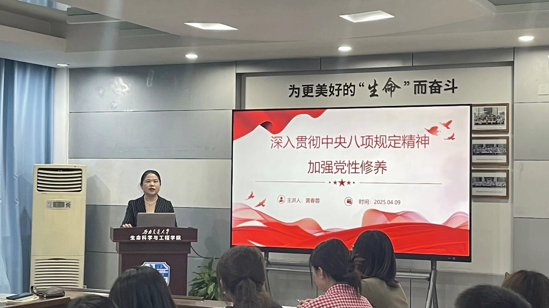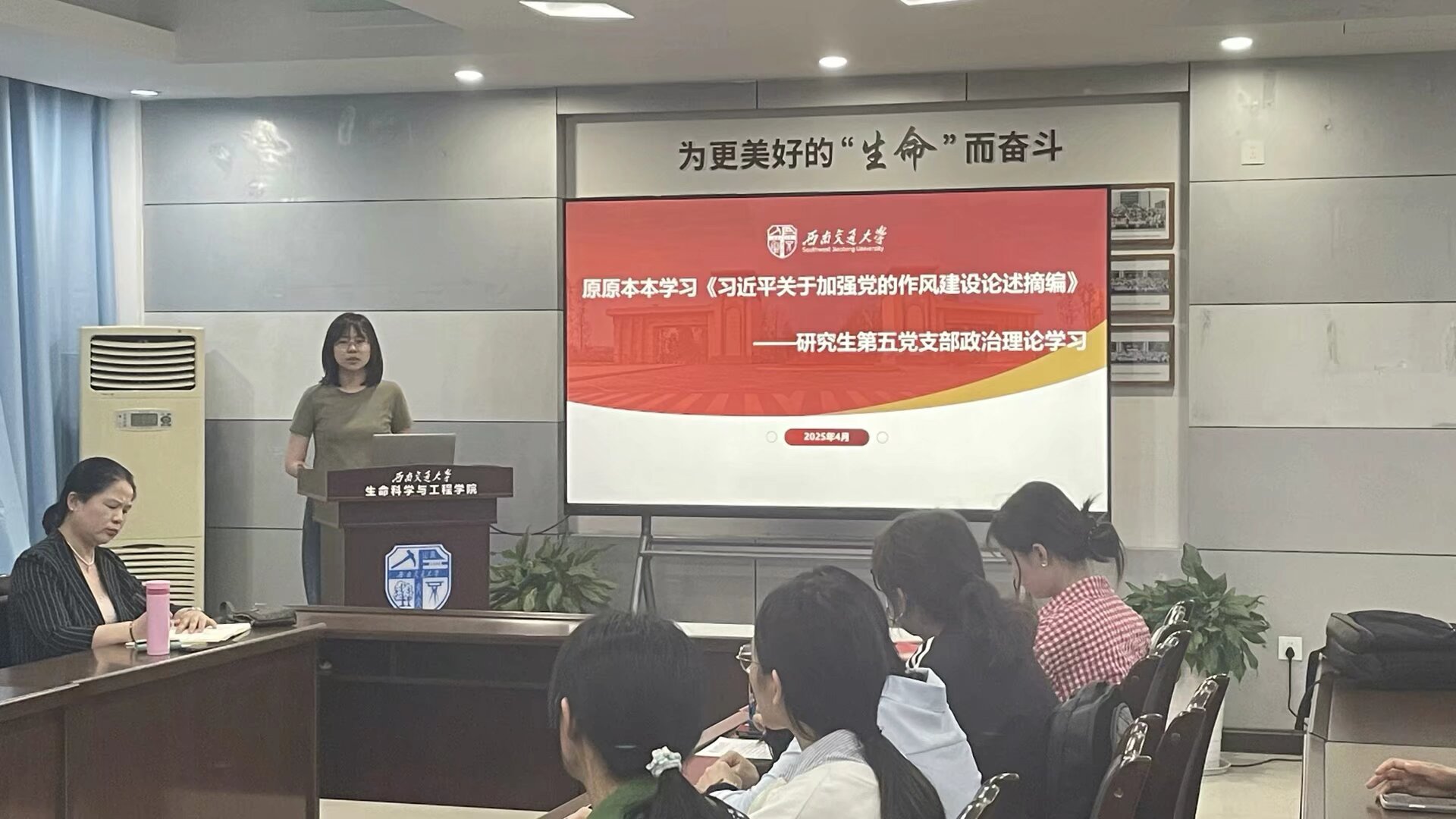 研究生第五党支部于2025年4月10日19:30在J3609开展了主题党日活动,会议由党支部书记陈硕主持,学院党委书记黄春蓉参加活动并讲党课,旨在加强党员作风建设,提升党员思想觉悟,推进作风建设常态化长效化。