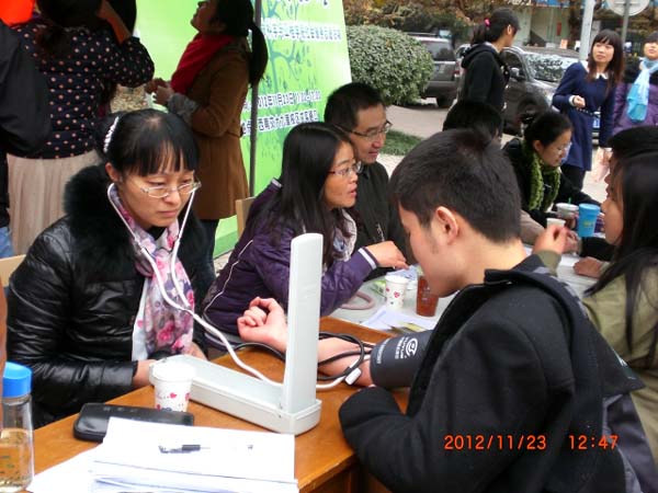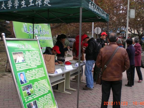 的五位专家学者准时到场,而此时现场已有一些老年人和同学在等候。五位专家一就座,就开始细心听取咨询者们反映的关于自身健康和营养方面的问题。他们耐心地帮咨询者进行分析和指导,给出了自己的意见和建议,中医药“大夫”们还现场开具了处方,让咨询者们心满意足。过往的很多学生也纷纷赶过来,测量血压、营养咨询、询问病因和预防措施……路过并咨询的人也越来越多,在场专家和党员志愿者们也忙的不亦乐乎,五位老师在现场简单地用完盒饭后马上又投入到了咨询服务中去。尽管天气略显寒意,但丝毫挡不住大家的服务热情,咨询现场一度火热。直至下午五点,仍有不少人前来咨询,老师和志愿者们坚守岗位,竭诚为最后一位咨询者服务完才离开。