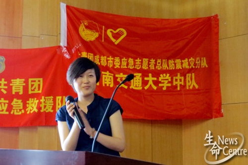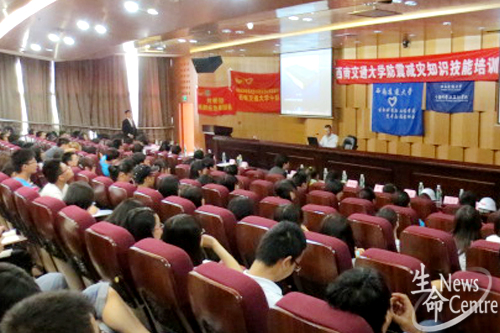 团委副书记孔琳老师致辞,在大家观看了一段以4·20雅安地震为主题的视频之后,全体肃立,对地震中的遇难同胞行默哀礼。9:50,培训正式开始,第一项由成都市应急志愿者总队防震减灾分队队长樊晓凡老师结合成都地形、自己在唐山-汶川-芦山三次地震前线抢救的体会及在其他高校进行逃生演习时发生的问题,向大家详细讲解紧急逃生时的注意事项,他重点提到个人要有危机意识,要提前准备好急救包,以备不时之需。