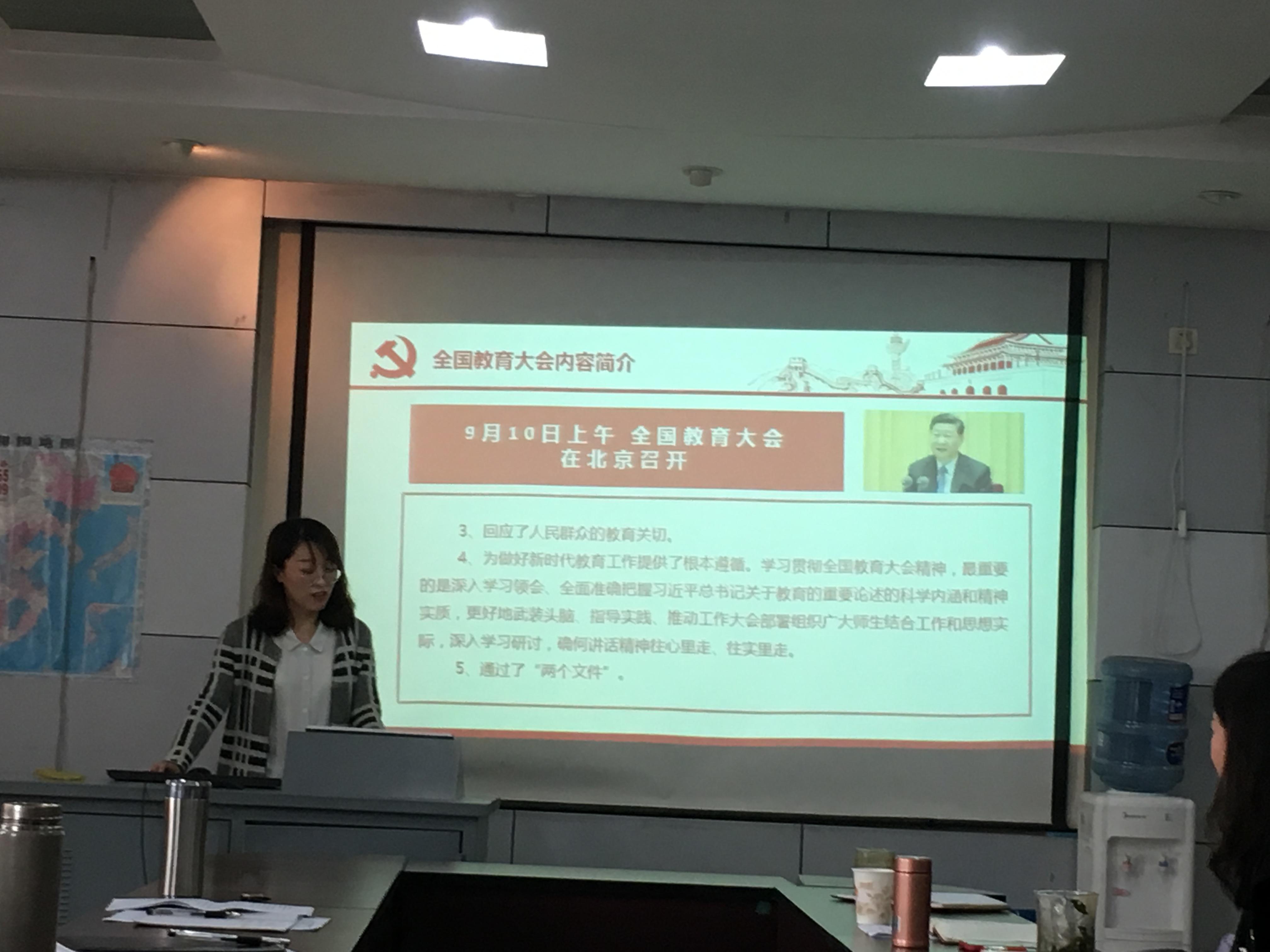 会上首先由党委委员、党务秘书贺妍同志带领与会人员集体学习了新修订的《中国共产党纪律处分条例》。贺妍同志以“凸显纪律建设新成就——透视新修订的《中国共产党纪律处分条例》九大亮点”为题,详细解读了新《条例》的修订背景、理论依托、主要内容、关键条例、突出作用和精神内涵等。接下来,专职组织员华晶晶同志带领与会人员集体学习了全国教育大会精神,着重介绍了全国教育大会的召开背景、重大意义和主要内容等。