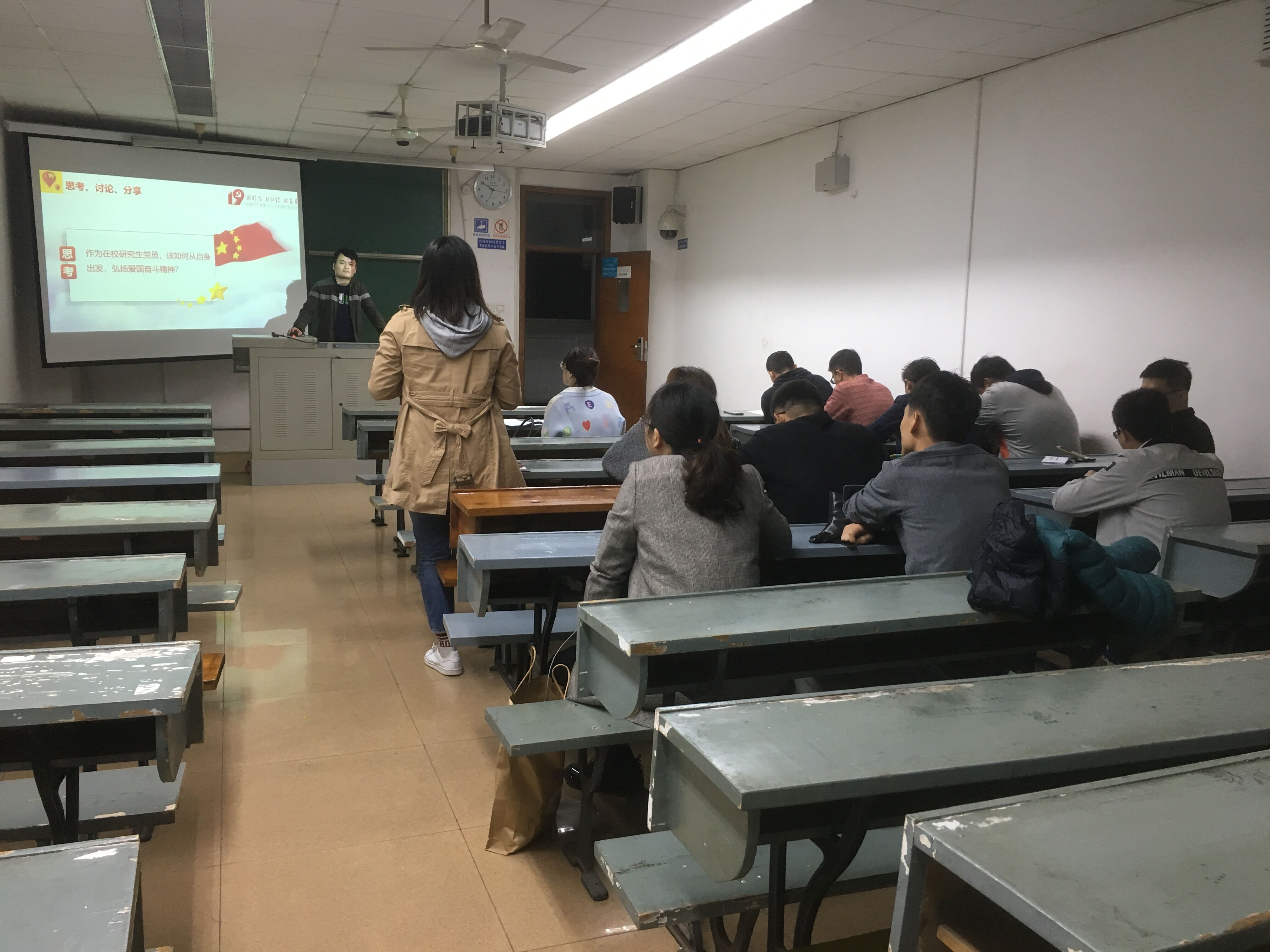 2016级硕士党支部于1018日晚在4305A教室召开“弘爱国奋斗精神,扬硕士党员风采”主题党日活动。活动由支部书记韦乐华主持,支部全体党员参加了学习,支部指导教师、学院专职组织员华晶晶也出席了本次活动。
