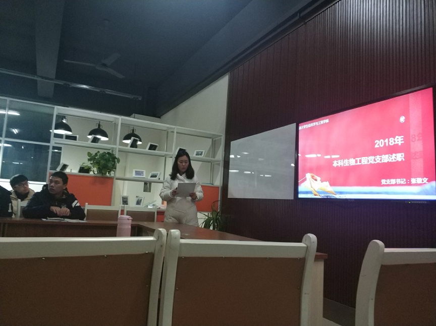紧接着,由支部书记张敬文代表支部委员进行了2018年度本科生物工程党支部工作总结,并对党支部班子存在的问题进行查摆,张敬文总结了再过去的一年,支部组织建设较为完善,支部构建机制多样,以特色活动为载体,将思想政治教育贯穿始终,并树立优秀党员典型人物,发挥党员先锋模范作用。但是支部工作还存在理论学习效果不够等不足,随后全体党员对支部班子的工作、作风进行了肯定,也针对不足提出了意见。