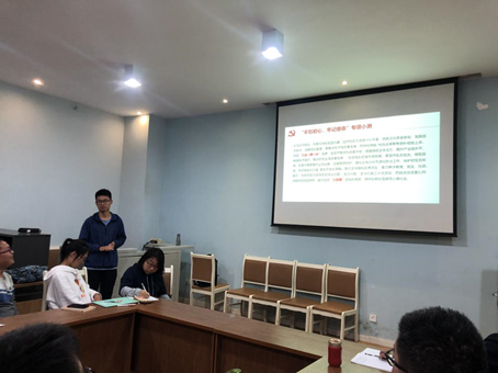 随后由预备党员黄斌翰带领大家进行“共和国70年光辉历程”心得分享。黄斌翰就“习近平在内蒙古考察并指导开展‘不忘初心,牢记使命’主题教育”及文章《“习近平同志倡导年轻人要‘自找苦吃’”——习近平在厦门(十三)》组织大家展开学习讨论。期间,他将习近平在内蒙古的考察指导概括为人民生活、文化发展、教育培养及生态建设四个方面,并以题目问答的形式加深同志们的印象,提高学习效率。接着,黄斌翰结合自身科研竞赛及暑期“三下乡”社会实践经历,深入浅出地分享了关于对“年轻人要‘自找苦吃’”的理解,并强调了大学生社会实践的必要性及重要性,得到了与会人员的一致认可。