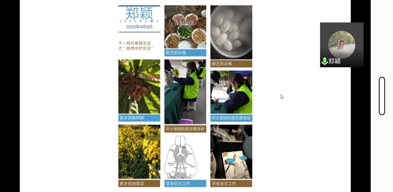 接下来,支部每一位成员以“疫情里的春天”为主题进行了图文故事分享。李姗蓉同学通过现在依然是白雪皑皑的毕棚沟联想到了仍笼罩在“疫情冬天”中的我们,并希望这场雪退去以后,会看到和谐、生机勃勃的毕棚沟,就像疫情过去之后,我们将迎来开满樱花、美丽的武汉和生气蓬勃的中国;党春阳同学分享了燎干节大火熄灭以后空地上留下的通红的灰烬,他说燎干节表达了劳动人民对新的一年粮食丰收的期望和对美好生活的向往,希望疫情早日结束,一切回到正轨,我们的国家巍然屹立于世界东方,五星红旗的光辉照耀世界的每一个角落;郑颖同学分享了自己清明节期间在烈士陵园做志愿者,为来缅怀烈士的人量体温、消毒的经历,从而想到了那些每天奋战在一线的医务工作者们,表达了对他们的崇高敬意;王傲雪同学分享了渔港公园大雨过后的云和海,她说这次疫情就像这场突如其来的大雨,狂风暴雨虽然吓人,不过只要坚持住,阴雨就一定会散去,阳光也会洒向大地,我们的生活会和海港一样迎来平静与祥和,我们经历过的寒冷也都会被治愈……同学们都通过自己的分享表达了对奋战在抗疫一线的逆行者们的崇高敬意,并坚信疫情过后我们会迎来崭新的中国。