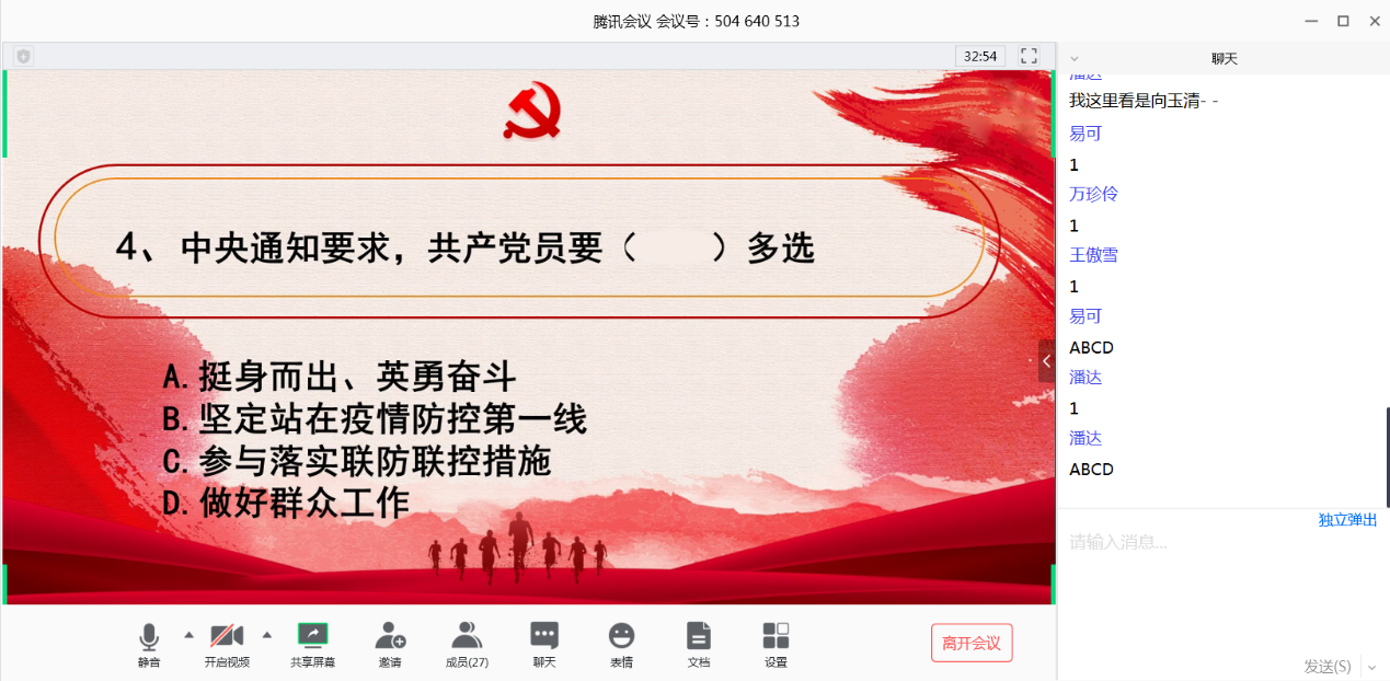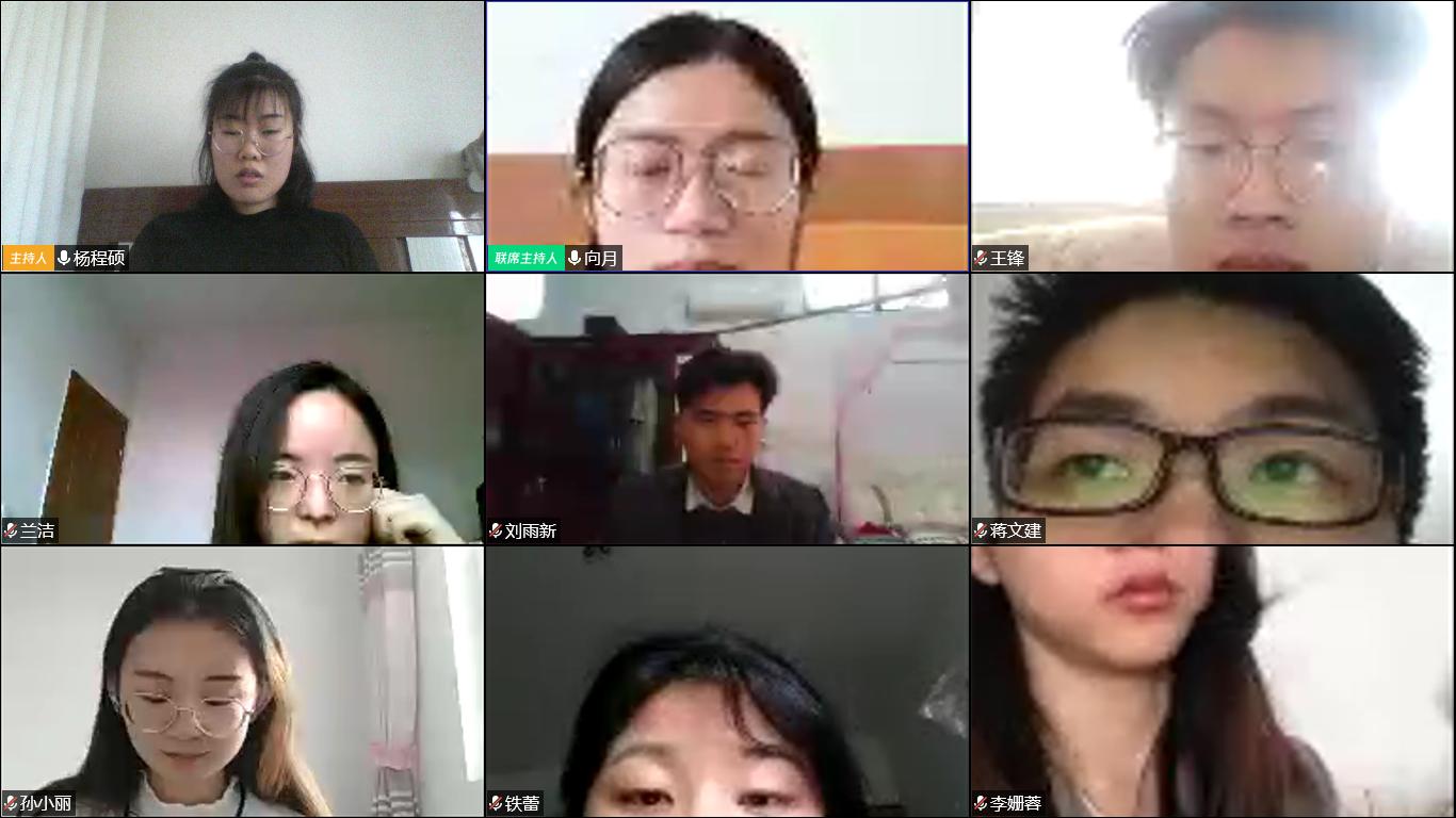 本科制药工程党支部通过腾讯会议开展了“疫”情里的春天——抗“疫”知识大赛暨图文故事征集线上活动,学习习近平总书记关于新冠肺炎疫情防控工作的重要指示批示和讲话精神并交流学习心得,学习抗击新冠肺炎疫情一线先进人物事迹,进行抗疫知识竞赛,并以“疫情里的春天”为主题进行了图文故事分享。本科制药工程党支部全体正式党员、预备党员参加此次活动,活动由本科制药工程党支部副书记向月和组织委员杨程硕主持。