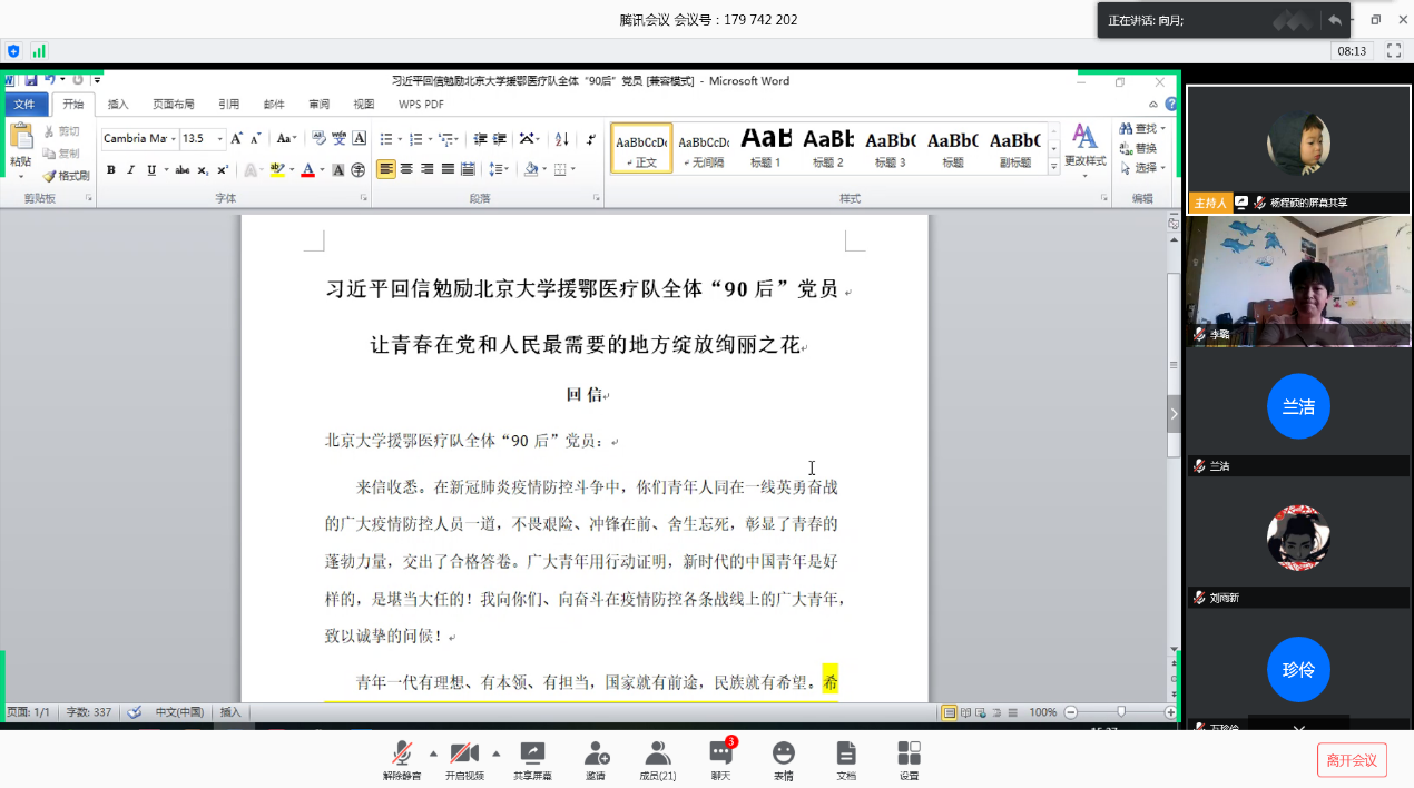 本科制药工程党支部通过腾讯会议召开主题党日活动,会议内容为学习贯彻“习近平总书记重要回信精神”,加强新时代高校青年党员队伍建设。此次活动由党支部副书记向月同志主持,支部全体成员参加活动。
