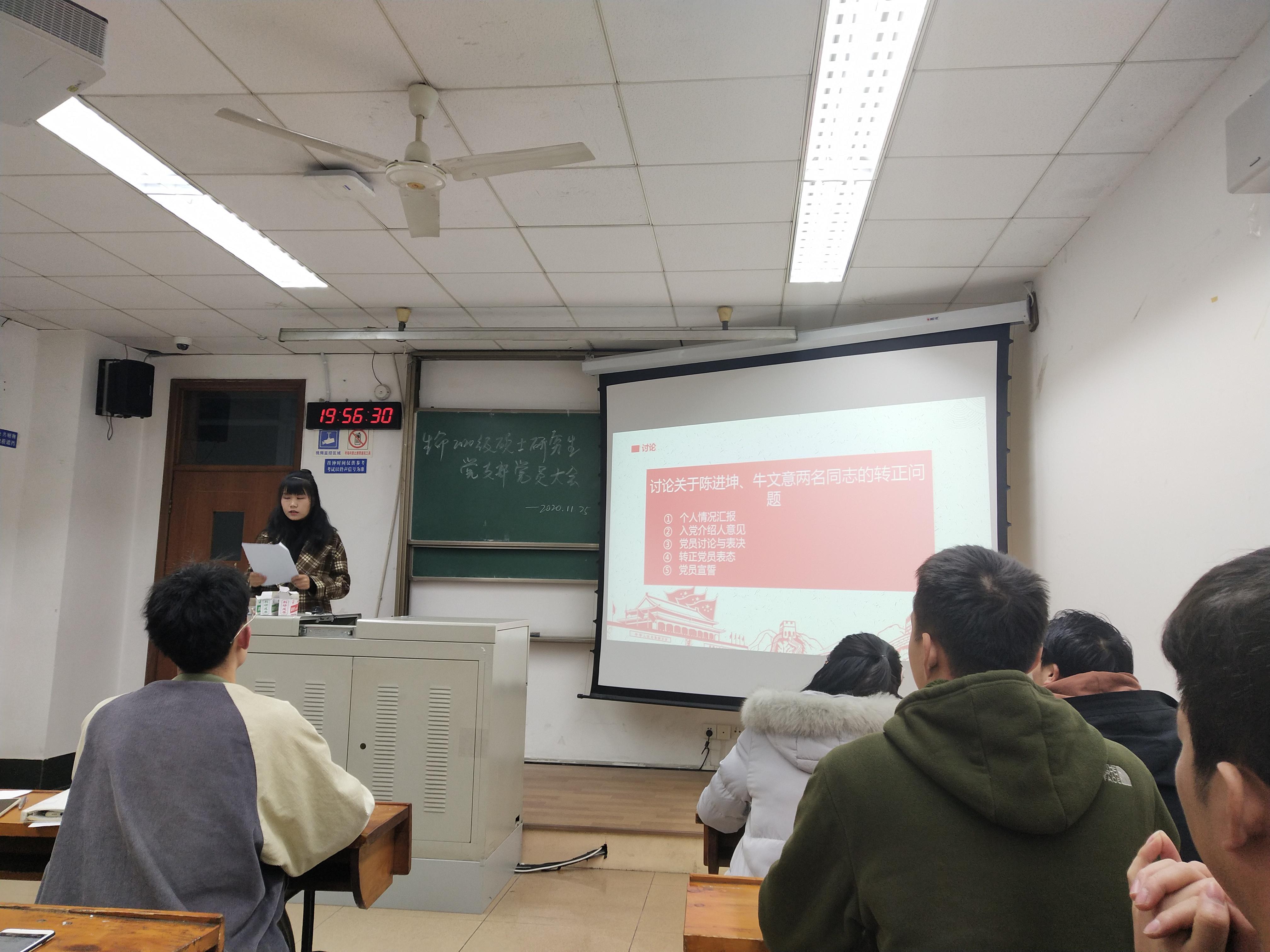 2020级硕士研究生党支部在九里校区四号楼4304B教室召开预备党员转正支部大会,讨论并表决牛文意、陈进坤两名中共预备党员能否按期转为正式党员事宜。会议邀请了研究生辅导员兰卓老师和张硕老师参加,会议由支部副书记万珍伶主持。