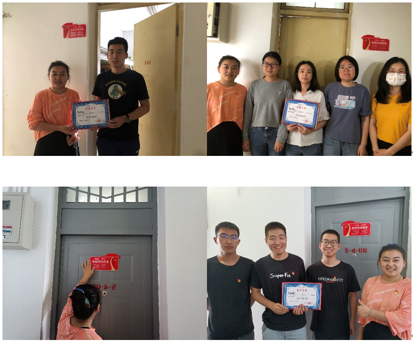 兰卓老师和胡慧怡老师首先为获得“党员示范宿舍”称号的J125030、J123053、J54008、T154060四间宿舍依次颁发了荣誉证书,并为“党员示范宿舍”挂牌,同时,为保障同学们在宿舍的学习和生活安全,兰卓老师、胡慧怡老师及院研究生会深入学生宿舍,依据《微密圈