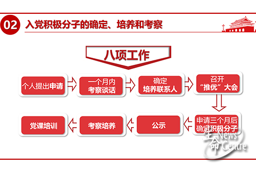 接着,黄斌翰老师向驻班党员们详细介绍了发展党员的工作流程。党员发展的工作流程主要分为5个阶段。在申请入党阶段,年满18岁的中国公民在向经过党内外座谈、团支部“推优”、支委会讨论确定发展对象人选、上报上级党委列为发展对象,接受入党组织递交入党申请书后,党组织派人进行谈话教育引导;之后班级团支部通过“推优”确定入党积极分子,入党积极分子将接受党组织指定培养联系人的进一步培养教育考察;经过一年以上培养考察且党课结业的积极分子,介绍人的培养教育及政治审查后方可成为发展对象;通过学校党课培训同时支部委员会审查合格的发展对象,经上级党委预审在入党介绍人的指导下填写志愿书,经支部大会讨论、上级党委谈话,报上级党委审批后成为预备党员;经上级党委批转的预备党员将被编入党支部和党小组,进行入党宣誓,继续接受教育考察;预备期满1年,经支部大会讨论审查、上级党委审批后转正成为正式党员。