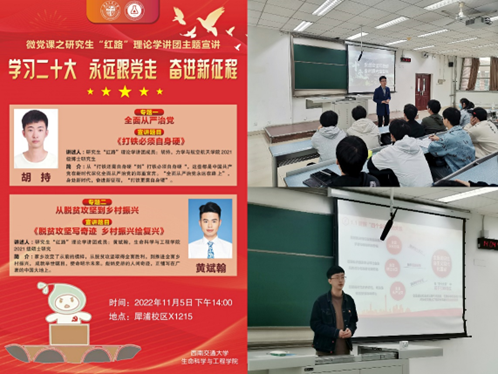 本次党日活动的第一项内容是微党课,主讲人为研究生“红路”讲学团成员——胡持同志和黄斌翰同志。引领全体党员发展对象主要从全面从严治党、脱贫攻坚、乡村振兴三个方面对党的二十大报告进行学习。