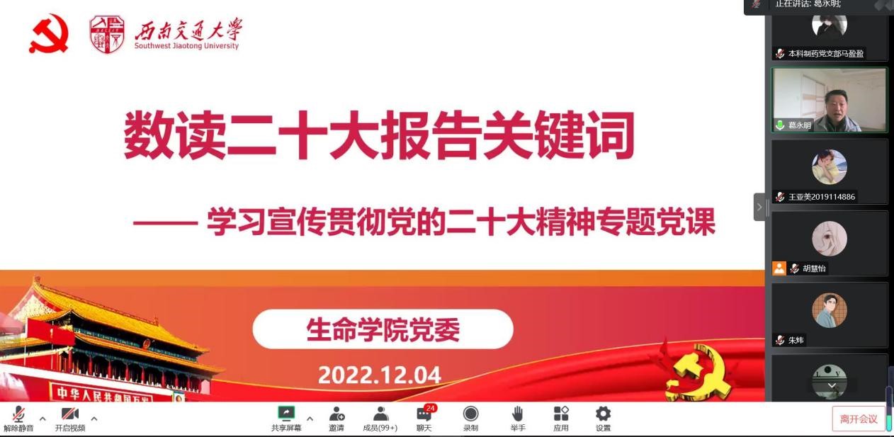 党委书记葛永明同志以“数读二十大报告关键词”为题,为学院两百余名师生党员专题讲授党的二十大精神。葛永明书记带领全体党员同志回顾党的二十大的大会主题,用9个数字来数读二十大报告中的新观点、新论断、新思想。