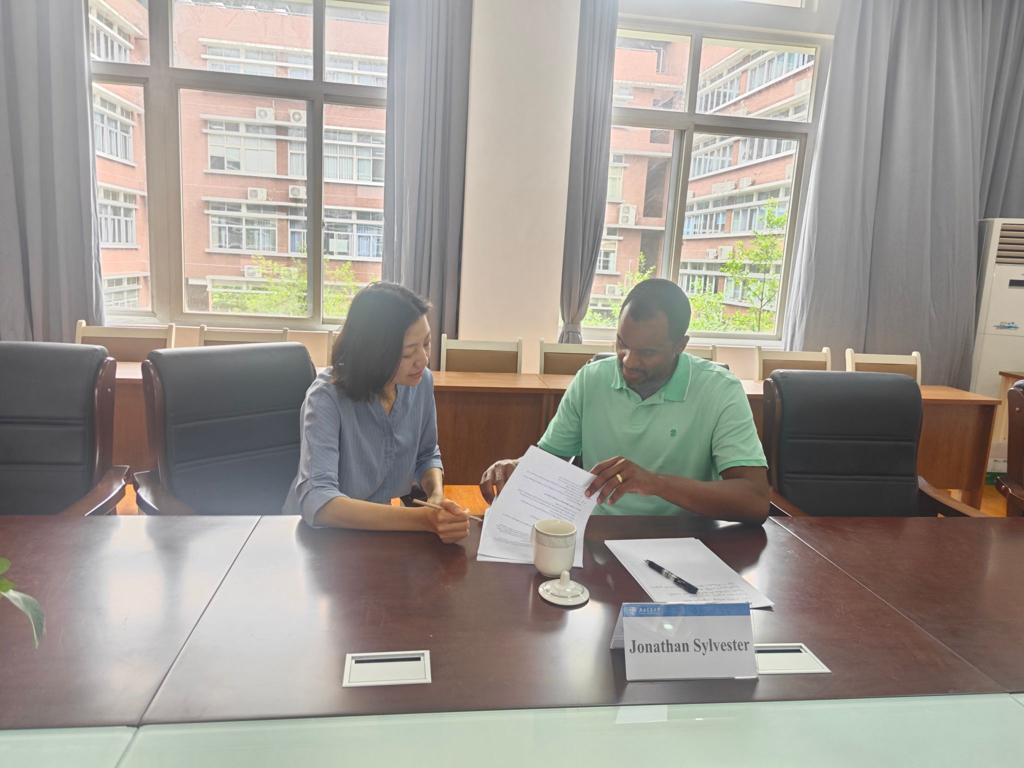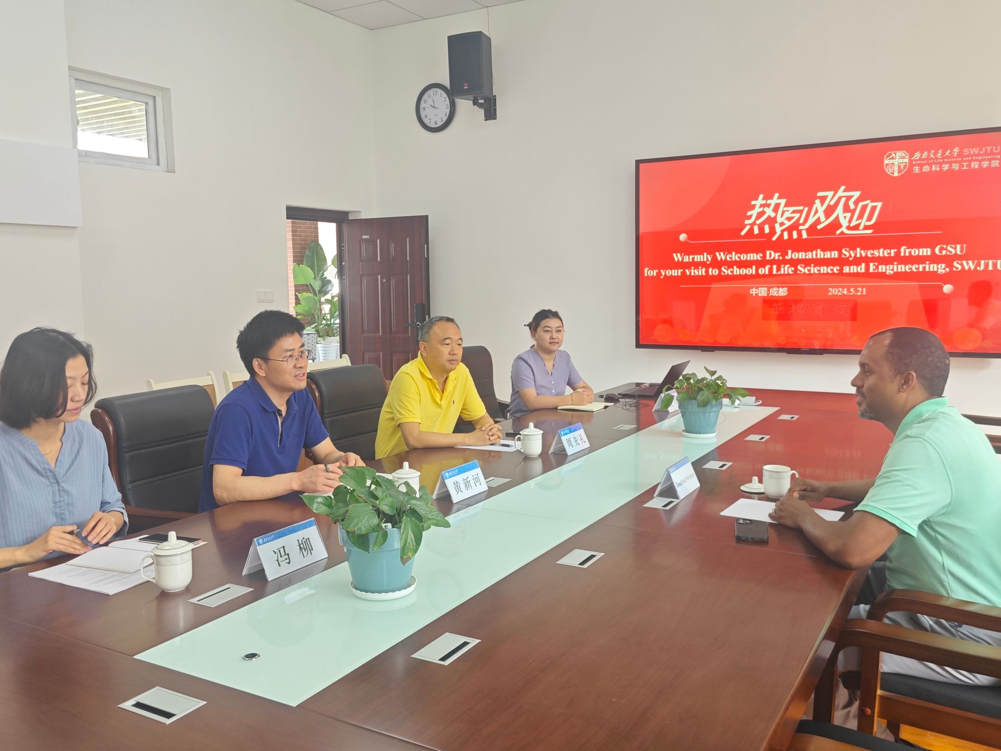 院长周先礼教授、中美班教务冯柳老师以及中美班事务员兰卓老师共同参与。黄新河老师首先对Dr. Jonathan Sylvester的到来表示热烈欢迎,并介绍了与会的各位成员。
