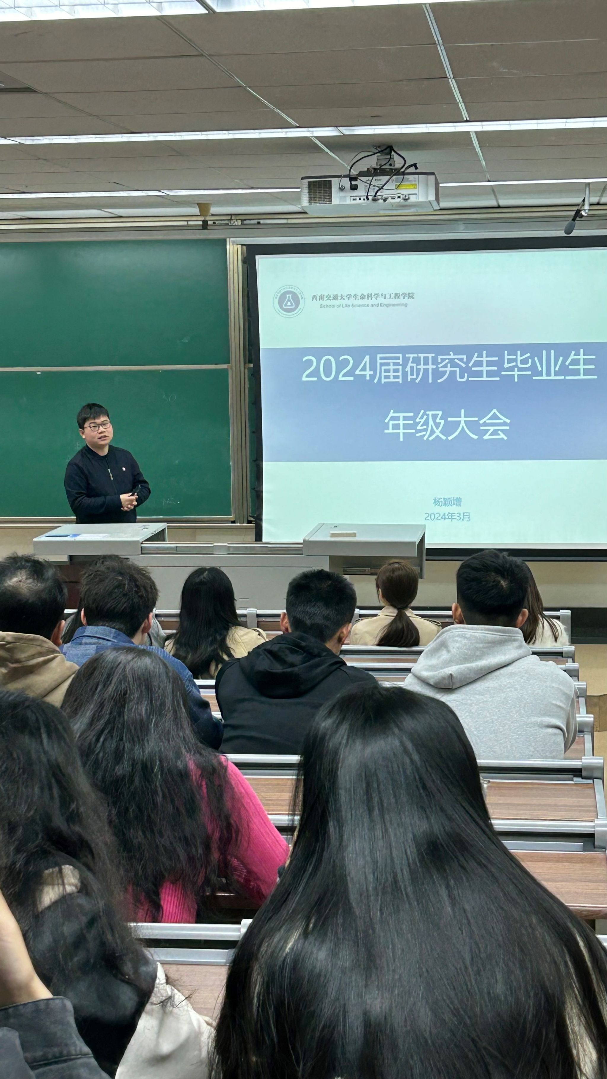 2024324日下午,学院在J4323教室召开2024届研究生毕业生年级大会暨“就业大讲堂”。会议由学院青年讲师团成员杨颖增主持,学院院长助理、学生支持办公室主任华晶晶、全体研究生辅导员参会。