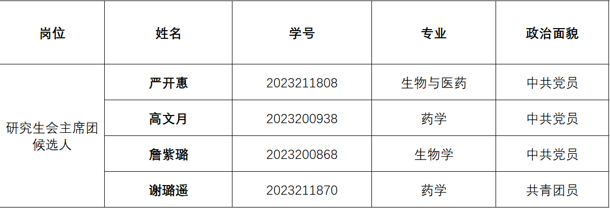 委员会关于推进学生会(研究生会)深化改革的实施方案》(西交党〔2020〕40号)要求,经自主报名、资格审核、面试答辩等环节,综合考核评议确定学院第十一届研究生会主席团候选人,具体名单公示如下: