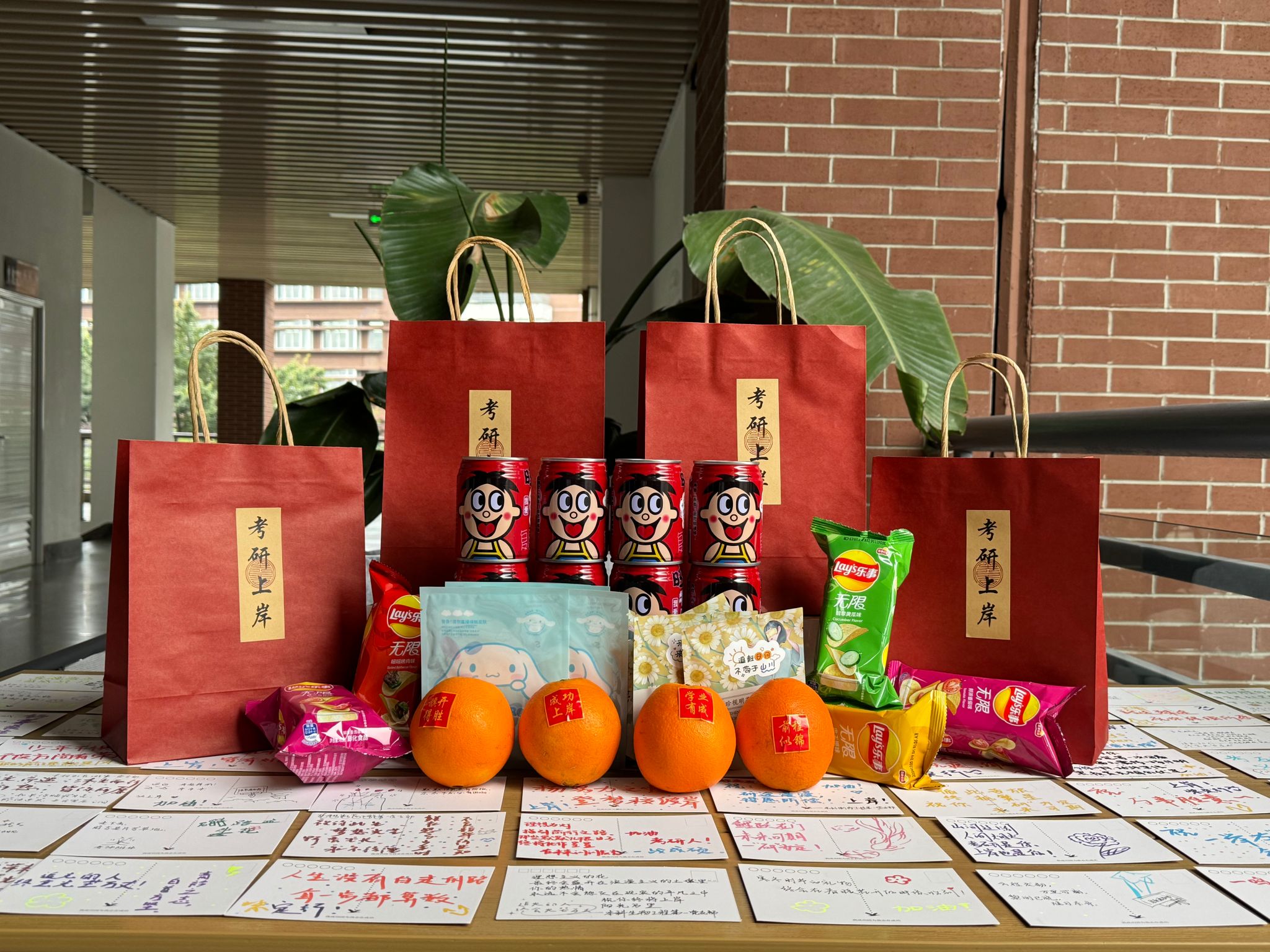 学院为考研学子精心准备的“考研上岸”暖心礼袋,礼袋里每一份礼物都寄托着学校对考研学子们的亲切关怀:学院师生亲手书写的明信片传达着对考研学子的殷殷祝福;橙子代表心想事成,一战“橙”硕;“乐事”薯条祝福学子们定能乐事发生;旺仔牛奶为考研学子们传递好运旺旺;暖身贴为在冬日里辛苦备战的学子们加油助力,鼓励着每位学子以昂扬的斗志和积极的心态投入到备考中。