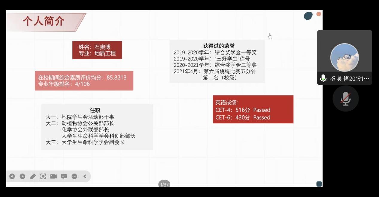 紧接着是由地质工程专业的石奥博学长带来的推免经历分享。在分享中,学长首先进行了专业成绩要求和免研政策的解读。还补充了许多自己对于大学学习习惯、心态等新生初入大学所面临的常见问题的细致解答。最后,学长真诚地提出了建议,希望每位低年级同学都应该对自己有明确的认知,找到适合自己的方向。