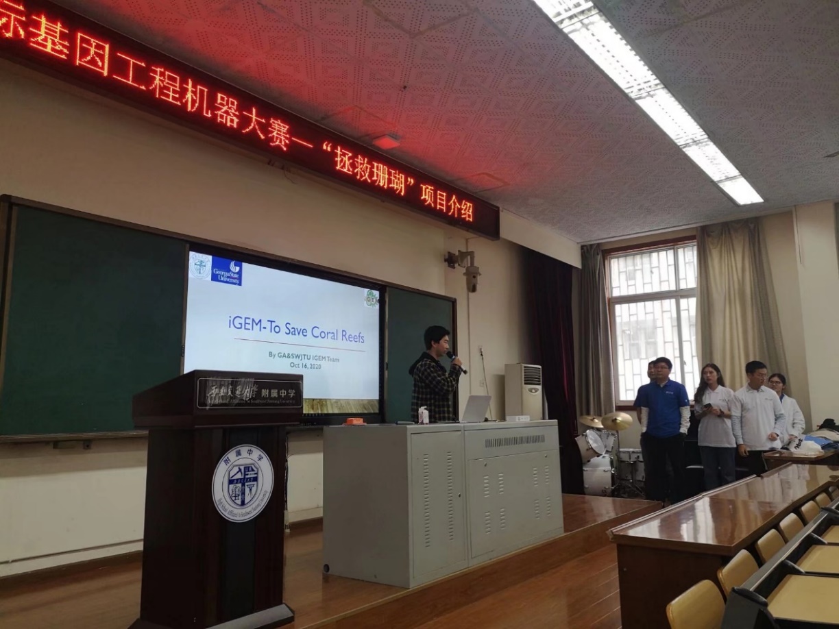 附属中学进行题为《Save Coral Reefs》的宣讲,完成本次比赛要求的社会实践(Human Practice)环节。本次宣讲以主题演讲和话剧表演的形式,生动形象地向高中生展示为什么珊瑚会白化,我们是如何培养藻类、如何设计和制作基因枪并用它对生物进行基因改造的。同学们反响良好,互动积极。通过本次宣讲,同学们成功向社会普及了珊瑚白化相关知识,提高社会保护珊瑚的意识。