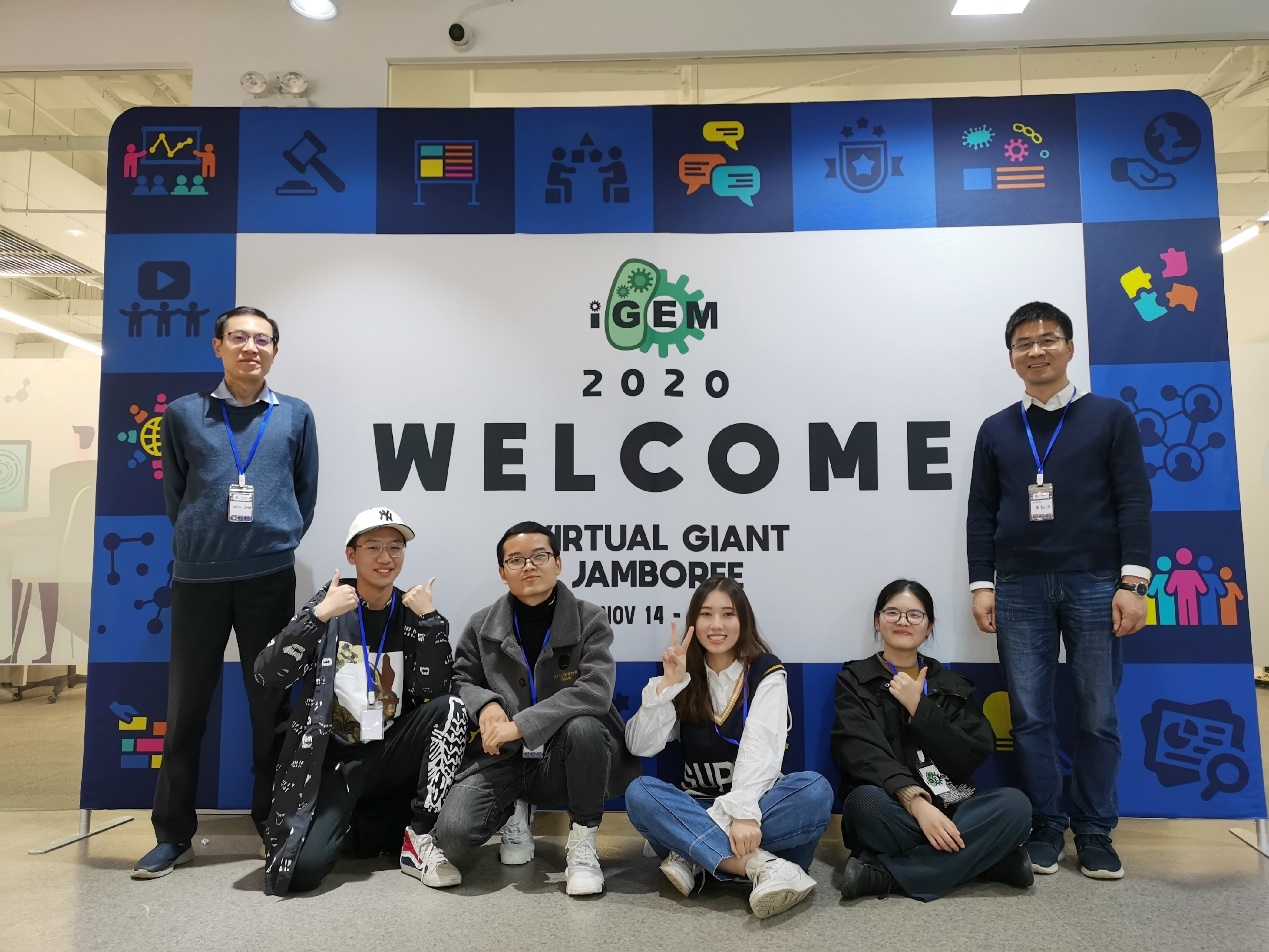 的黄新河、廖海、周嘉裕、朱乾坤等4位教师和乔治亚州立大学的Dr. Matt Brewer共同指导。该团队的部分教师和学生也参加了2019年第十六届iGEM比赛并获得铜奖。在吸纳新成员后,团队继续以“珊瑚白化研究(Synbio-dinium A synthetic biology solution to coral bleaching )“为主题,采用合成生物学的设计理念,构建转基因珊瑚共生藻,为珊瑚白化及灭绝这一世界难题提供了新的解决思路和方案。本次iGEM比赛采用线上答辩,评委组对小组成员进行全英文提问,同学们对答如流,充分展现了我校学生全面发展的综合素质。北京时间11月22日21:00,由黄新河、廖海老师带队,杨晨、李浩然、朱宁馨、谭国栋等4位学生代表前往北京iGEM分会场参加闭幕式。我校同学与来自清华、北大等其他院校的同学积极互动,深入交流学习比赛经验与心得。