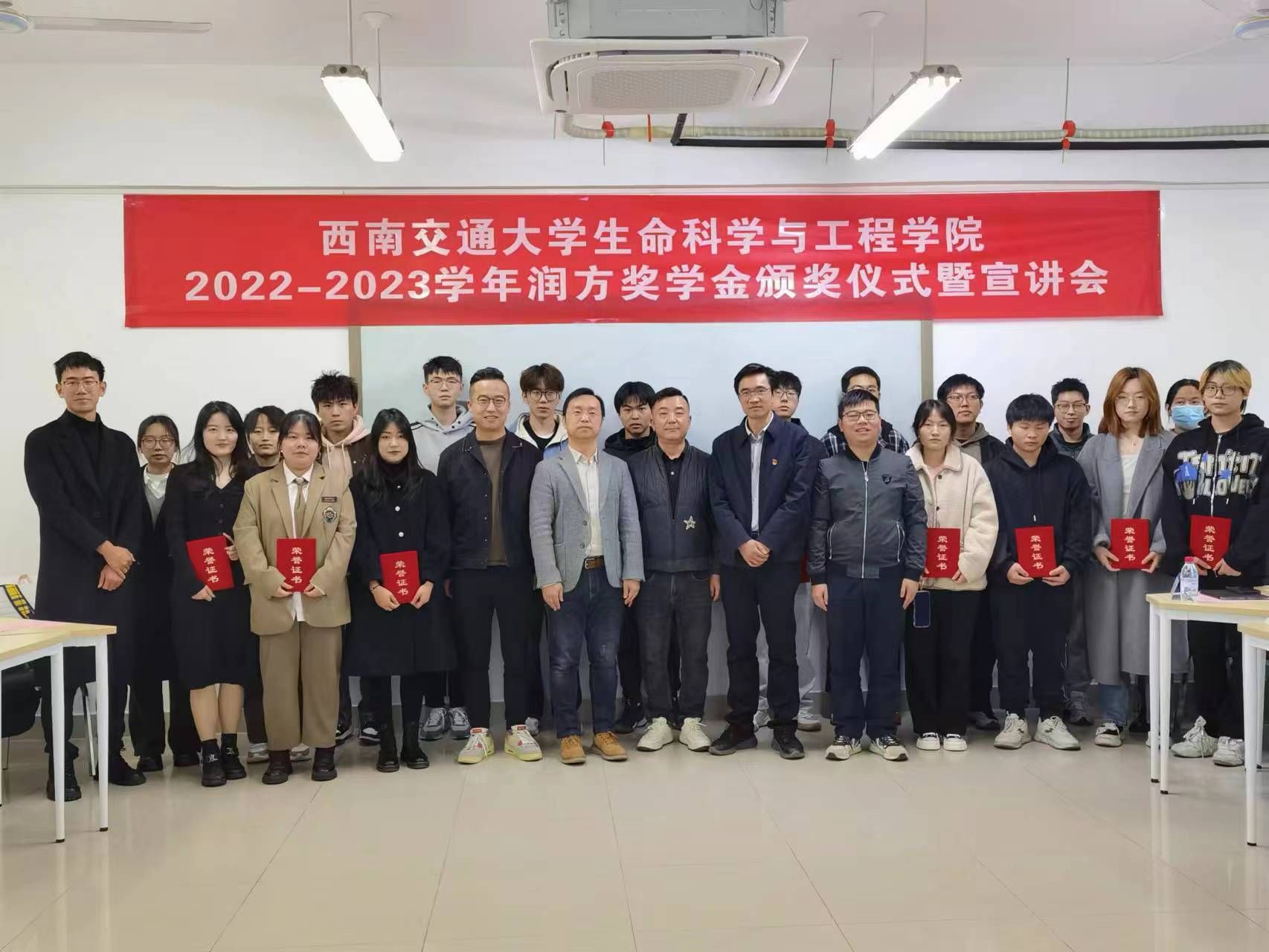 举行2022-2023学年润方奖学金颁奖仪式。润方生物有限公司总经理刘磊一行到校出席颁奖仪式,学院党委副书记朱炜、生物工程系教授孟涛、团委副书记杨颖增、潘星宇及2022-2023学年润方奖学金获奖同学参加颁奖仪式。