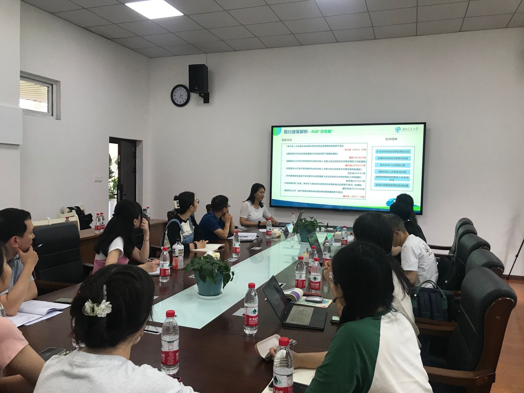 进行科研财务工作进行培训和指导表示欢迎,强调老师们应加强党纪学习,理清政治与业务、公与私的关系,明确科研经费的国有资产属性,在经费的使用管理中增强纪律性与原则性。李遂焰副院长介绍了学校近几年出台的科研政策,要求老师们和研究生要主动进行规章制度的学习,特别重点强调了涉密项目管理的要求,并带领与会师生学习了科研项目招投标警示案例。