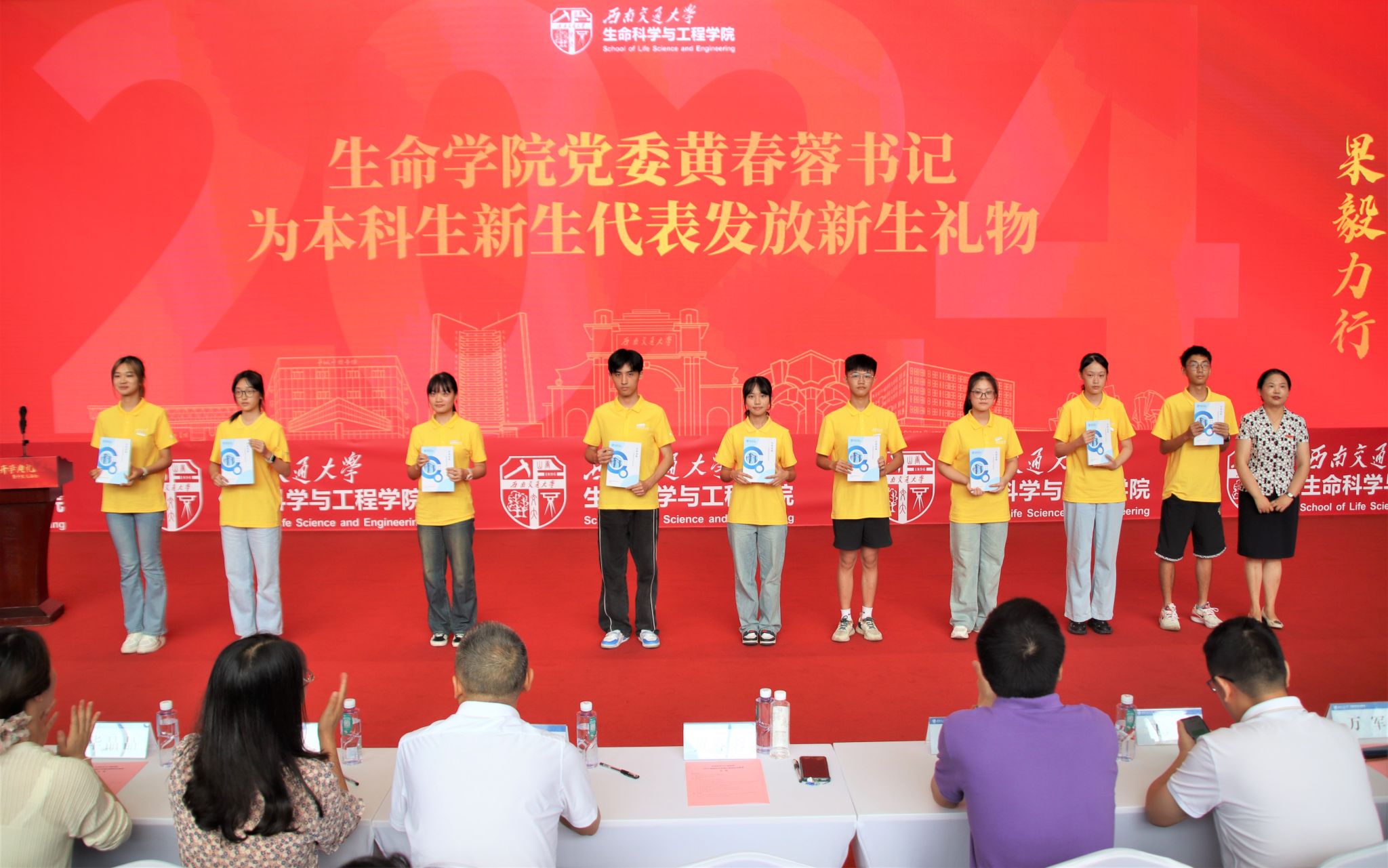 为切实加强学风建设,引导广大生命学子学思践悟、互帮互助,学院向学生收集优秀课程学习经验总结,经过自查修订、复核评选、排版整理等多个环节,最终形成《生命宝典》,作为新生礼物之一。现场,黄春蓉书记为2024级本科生新生代表赠送《生命宝典》。
