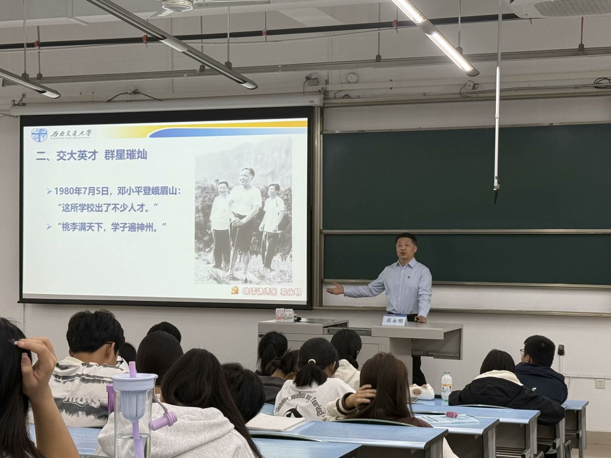 。真的是步履维艰,抗日战争的火焰让我们被迫转移,北京,上海,湘南,唐山……我们四处奔波几十年,终于落脚到了四川。然后是建校以来的各位传奇人物,其中最为突出的便是茅以升教授了,少年天才,即使时光荏苒,也风华依旧。让我印象最深的便是“人民大会堂的建成,必须有茅以升的签名作担保。”这是在建筑学上何等崇高的地位啊,葛老师还讲到茅老先生即使90高龄也仍然能背出圆周率小数点后100位,甚至老师当场向我们表演了500位的背诵,全场掌声雷动,赞叹不已。其次便是詹天佑先生,虽不是交大学子,却又与交大密不可分,詹先生学贯东西,折服了不少西方学者。詹先生实事求是的精神也值得我们学习,“詹式车钩”的谣言盛极一时,面对这种荣誉,他选择了“无功不受禄”,主动出书立著来澄清这挂钩不是他所发明的。讲座最后全体起立,跨越数年,又回到祖国母亲七十周年的生日,与视频中的人们共同喊出那“强国有我”的口号,让我又一次的感受到胸腔中爱国情怀的涌动。葛永明老师的校史校情讲座是有活力,有生机,是真正能让观众用心去聆听的好讲座!