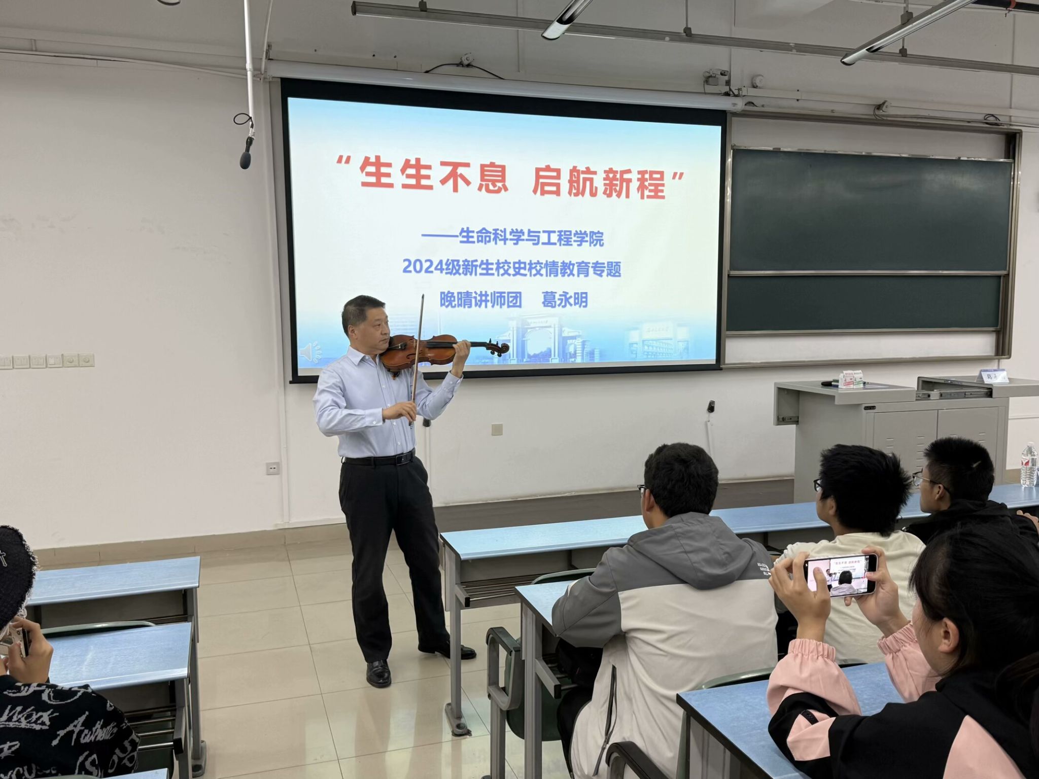 “晚晴讲师团”成员葛永明老师做客学思讲坛,以“生生不息,启航新程”为主题为全体新生开展校史校情教育专题报告会。学院2024级全体本科生参加本次报告会,报告会由学院团委书记杨颖增老师主持。