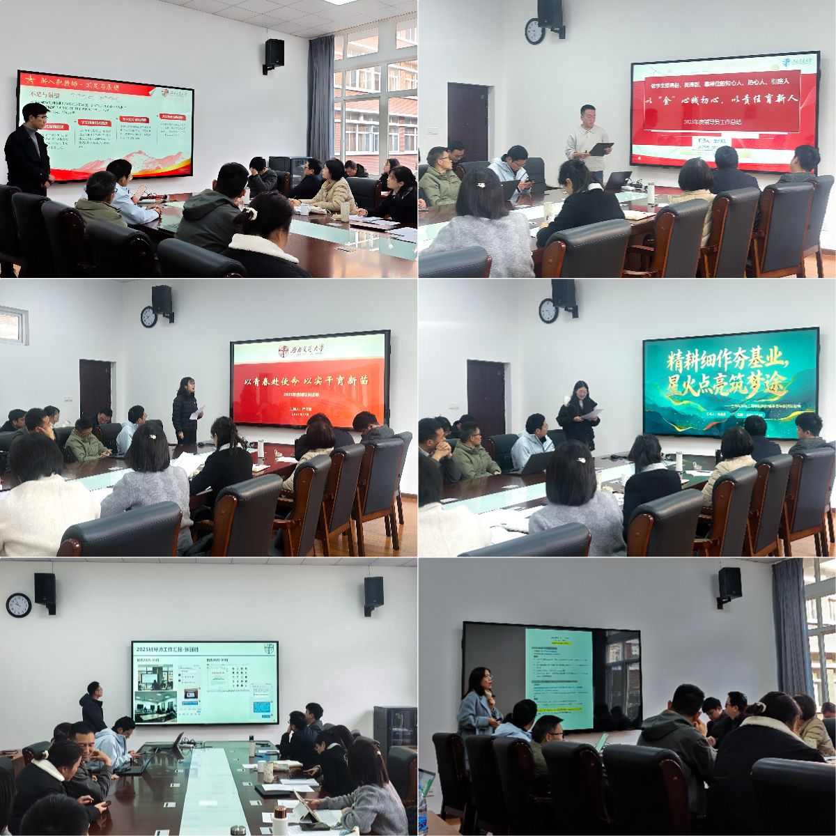 在工作述职环节,辅导员与班导师两支队伍协同联动,共同诠释“融通共育”的生动实践。7位辅导员老师立足立德树人根本任务,围绕辅导员九大工作职责,从学生日常管理、专项工作成效、个人工作亮点与未来规划等方面进行了系统汇报,全面展示了一年以来的工作成效。18位班导师则从专业教师视角,聚焦“学业指导、科研启蒙、创新培养、专业规划”四个维度,汇报了指导学生专业成长的过程。