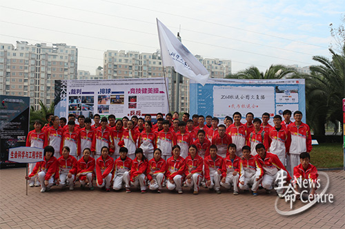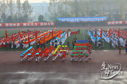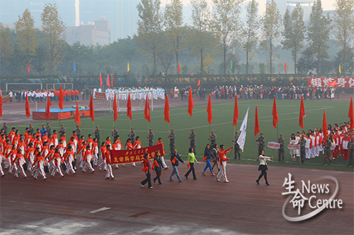 的健儿们在院长周先礼、院党委书记李卓慧、副书记罗妍妍、副院长谭睿、工会主席胡久梅、团委书记高鹏的带领下入场,他们精神抖擞,步伐矫健。走到主席台前时,大家整齐地拼出了LIFE的字样,并整齐的喊着“微密圈