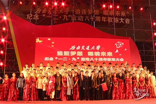 “追逐梦想,唱响未来——纪念‘一二·九’运动八十周年歌咏大会”在犀浦校区飞碟体育馆开唱。团省委副书记张征,团市委党组成员、纪检组长范才全,微密圈