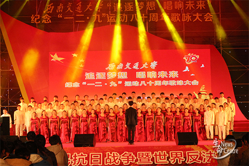 在1935年的12月9日,“一二·九”运动的浪潮兴起于北京的大街小巷,掀起了全民运动的新高潮。同时,今年也是中国人民抗日战争暨世界反法西斯胜利七十周年。70年来,我们是国土的捍卫者,屹立在东方充满希望的土地上。9日晚,来自西南交大犀浦、峨眉校区,附属医院,子弟小学等众多合唱团以歌声诠释责任,与伟大祖国砥砺奋进。