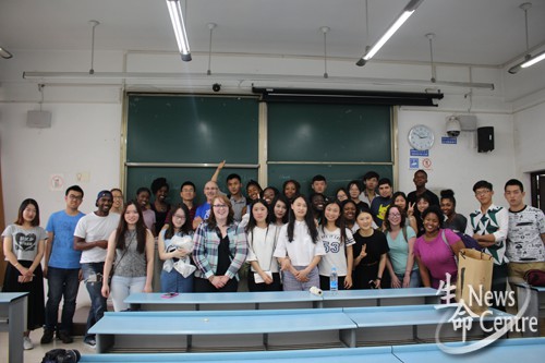 2014级生物工程中美班导师黄新河主持,来自美国乔治亚州立大学的14名学生及其带队老师Eric及来自中美班的21名同学参与了本次活动。