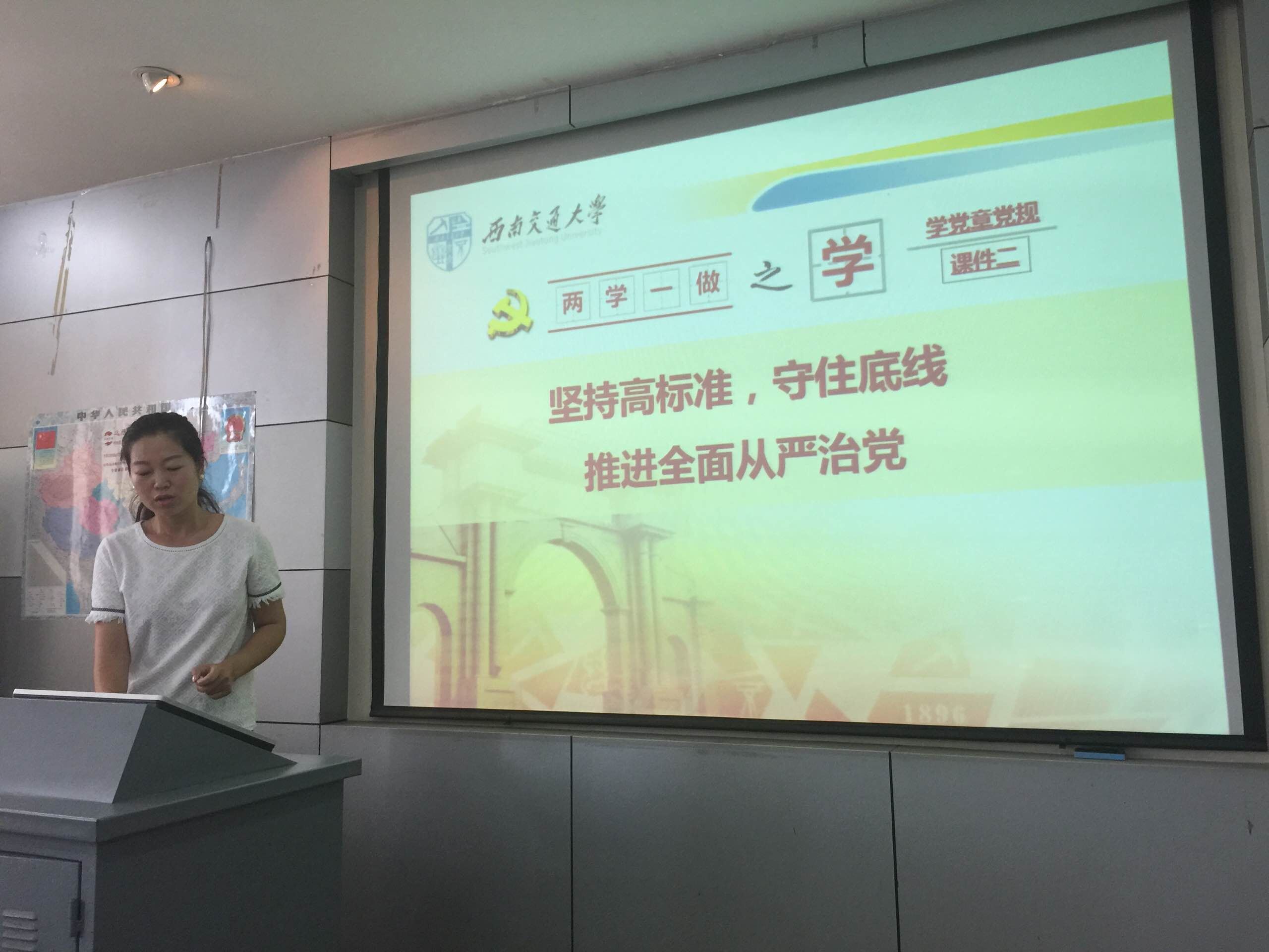 罗妍妍副书记讲课的题目是《坚持高标准、守住底线,推进全面从严治党》。她向与会党员介绍了修订《中国共产党廉洁自律准则》和《中国共产党纪律处分条例》的重要意义和基本原则,重点讲解了《准则》和《条例》的精神实质和主要内容,特别是结合工作实际,用生动的实例讲解了日常工作和生活中容易出现和忽视的问题。她指出,教职工党员要牢牢把握主体责任,严守党规党纪,在教学、科研、管理工作中严于律己、把握尺度、坚守底线、不犯错误。她最后强调:全体共产党员一定要自觉学习和贯彻《准则》、《条例》的重要精神,坚持高标准、守住底线,牢固树立“有标准、有方向、有戒尺、有底线”的思想信念,坚持将纪律挺在法律前面,永葆共产党员先进性。